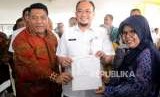 Layanan Pembayaran PBB. GM Bisnis Regional I Bank Bukopin Lalu Azhari (kiri) bersama Kepala BPRD DKI Jakarta Faisal Syafruddin (tengah) menunjukan bukti pembayaran bersama warga saat launching program pembayaran Pajak Bumi dan Bangunan untuk Perdesaan dan Perkotaan (PBB P2) di Jakarta, Rabu (12/9). (FOTO : Republika/ Wihdan)