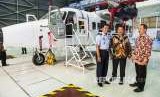 Direktur Utama PT Dirgantara Indonesia Elfien Goentoro (tengah) berbincang dengan Deputi Bidang Usaha Pertambangan, Industri Strategis dan Media, Kementerian BUMN Fajar Harry Sampurno (kanan) dan Komisaris Utama PTDI yang juga sebagai Kepala Staf Angkatan Udara (KASAU) Marsekal TNI Yuyu Sutisna (kiri) meninjau pesawat N219 disela perayaan HUT ke-42 PT Dirgantara Indonesia di Hanggar Rotary Wing, Bandung, Jawa Barat, Rabu (12/9). (FOTO : M Agung Rajasa/Antara)