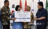 Ketua Inasgoc Erick Thohir (kanan) bersama Direktur Operasional Ritel Asuransi Kredit Indonesia (Persero) Anton Fadjar A Siregar (kiri) menyerahkan klaim asuransi kecelakaan kecelakaan diri kepada ahli waris ofisial Inasgoc Mangaraja Fortius Siregar, Taruli Marpaung (kedua kanan) di Jakarta, Rabu (12/9). Askrindo menyerahkan klaim asuransi kecelakaan diri sebesar Rp 133 juta kepada ahli waris Mangaraja Fortius Siregar yang meninggal saat bertugas. (FOTO : Puspa Perwitasari/Antara)