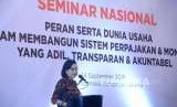 Menteri Keuangan Sri Mulyani memberikan keynote speaker dalam seminar nasional di Jakarta, Jumat (14/9). (FOTO : Republika/Prayogi)