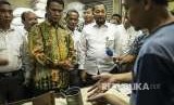 Menteri Pertanian Amran Sulaiman (tengah) bersama Dirut Perum Bulog Budi Waseso (kedua kanan) berbincang dengan pedagang ketika meninjau kestabilan harga beras di Pasar Kramat Jati, Jakarta, Jumat (14/9). Menteri Pertanian Andi Amran Sulaiman berpesan kepada para pengusaha atau pedagang beras agar tidak menaikkan harga untuk mengambil keuntungan berlebihan. (FOTO : Aprillio Akbar/Antara)
