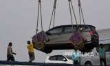 Pekerja menaikkan mobil ke atas kapal di Pelabuhan Sunda Kelapa, Jakarta, Jumat (14/9). Pemerintah menyatakan pembatasan impor otomotif dapat menggenjot produksi industri otomotif dalam negeri untuk kebutuhan domestik dan impor. (FOTO : Wahyu Putro/Antara)