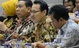 Dirut BPJS Kesehatan Fachmi Idris (tengah) mengikuti rapat kerja dengan Komisi IX DPR di Komplek Parlemen, Senayan, Jakarta, Senin (17/9). (FOTO : Republika/Prayogi)