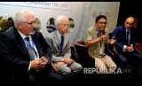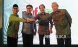 Direktur Utama Mandiri Syariah Toni EB Subari (kedua kiri) dan Direktur Utama MUF Stanley Setia Atmadja (kedua kanan), Ketua Dewan Pengawas Syariah MUF Prof Dr. Yunahar Ilyas, Lc.,M.Ag (kiri) dan Komisaris Independen MUF Mansyur Syamsuri Nasution (kanan) berbincang usai peluncuran MUFSyariah sebagai produk pembiayaan berbasis Syariah di Jakarta, Selasa (18/9). (FOTO : Edwin Dwi Putranto/Republika)