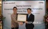 Direktur Utama PT Bank KEB Hana Indonesia Lee Hwa Soo (kanan) dan CEO PT Dimo Pay Indonesia (DIMO) Mario Gaw (kiri) berjabat tangan usai melakukan penandatanganan perjanjian kerja sama peluncuran fitur pada aplikasi mobile Bank KEB Hana yakni MyHana Pay by QR di Jakarta, Selasa (18/9). (FOTO : Prayogi/Republika)
