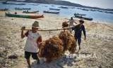 Petani memikul hasil panen rumput laut di Dusun Gerupuk, Desa Kuta, Kecamatan Pujut, Praya, Lombok Tengah, NTB, Selasa (18/9). Harga jual rumput laut kering di tingkat petani naik karena permintaan meningkat dari sebelumnya Rp8.000 per kg naik menjadi Rp16.000 per kg. (FOTO : Ahmad Subaidi/Antara)