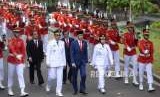 Pelantikan Gubernur NTB. Presiden Joko Widodo (tengah) bersama Pasangan Gubernur terpilih NTB Zulkieflimansyah (kiri) dan Sitti Rohmi Djalilah kirab bersama prajurit menuju pelantikan Gubernur di Istana Negara, Jakarta, Rabu (19/9). (FOTO : Republika/ Wihdan)
