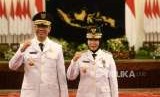 Pelantikan Gubernur NTB. Pasangan Gubernur terpilih NTB Zulkieflimansyah (kiri) dan Sitti Rohmi Djalilah berfoto usai pelantikan di Istana Negara, Jakarta, Rabu (19/9). (FOTO : Republika/ Wihdan)