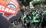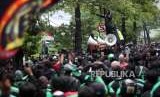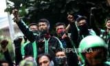 Pengemudi ojek online yang tergabung dalam komunitas Gerakan Aksi Roda Dua (Garda) melakukan aksi unjuk rasa di kantor Pusat Grab Lippo Kuningan, Jakarta, Rabu (19/9). (FOTO : Republika/Mahmud Muhyidin)