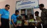 Director finance & commercial Pertamina Internasional EP Aris Mulya Azof (kedua kiri) berbicara kepada siswa saat penyerahan bantuan buku bacaan untuk SDN 1 Babadan, Gunungjati, Cirebon, Jawa Barat, Jumat (21/9). (FOTO : Tahta Aidilla/Republika)