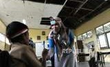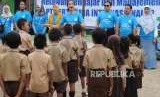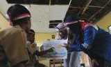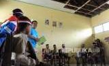 Relawan PT Pertamina Internasional EP (PIEP) sedang mengajar di SDN 1 Babadan, Gunungjati, Cirebon, Jawa Barat, Jumat (21/9). (FOTO : Tahta Aidilla/Republika)