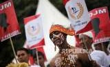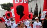 REPUBLIKA.CO.ID, JAKARTA -- Relawan Jokowi-Ma'ruf Amin berkumpul untuk menunggu kedatangan capres petahana Joko Widodo bersama cawapres Ma'ruf Amin di Tugu Proklamasi, Jakarta, Jumat (21/9).