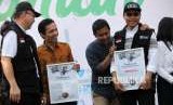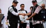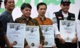 Pemimpin Redaksi Harian Republika Irfan Junaidi (kanan) memegang piagam penghargaan saat acara pucak Milad ke-25 Dompet Dhuafa di Tugu Proklamasi, Jakarta, Sabtu (22/9). (FOTO : Republika/Mahmud Muhyidin)
