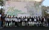 Sejumlah perwakilan media yang mendapat penghargaan dan para pengurus Dompet Duafa berfoto bersama seusai penyerahan penghargaan saat acara pucak Milad ke-25 Dompet Dhuafa di Tugu Proklamasi, Jakarta, Sabtu (22/9). (FOTO : Republika/Mahmud Muhyidin)