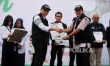Dewan Syariah Yayasan Dompet Dhuafa Republika Izzudin Abdul Manaf (kanan) menyerahkan penghargaan kepada Pemimpin Redaksi Harian Republika Irfan Junaidi (kiri) saat acara pucak Milad ke-25 Dompet Dhuafa di Tugu Proklamasi, Jakarta, Sabtu (22/9). (FOTO : Republika/Mahmud Muhyidin)