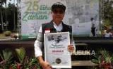 Pemimpin Redaksi Harian Republika Irfan Junaidi memperlihatkan piagam penghargaan saat acara pucak Milad ke-25 Dompet Dhuafa di Tugu Proklamasi, Jakarta, Sabtu (22/9). (FOTO : Republika/Mahmud Muhyidin)