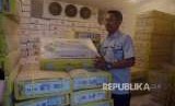 Pegawai Perum Bulog Divre Riau-Kepri menata daging beku di gudang Bulog di Kota Pekanbaru, Rabu (26/9). Bulog mendatangkan hingga 100 ton daging kerbau beku asal India, untuk menambah stok 43 ton daging yang ada. (FOTO : FB Anggoro/Antara)