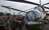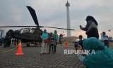 Warga berfoto dengan latar belakang helikopter pada pameran Alat Utama Sistem Senjata (Alutsista) di Monas, Jakarta, Kamis (27/9). (FOTO : Republika/Putra M. Akbar)
