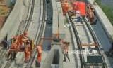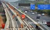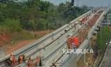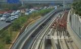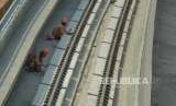 REPUBLIKA.CO.ID, JAKARTA -- Sejumlah pekerja saat menyelesaikan pemasangan rel LRT rute Cibubur-Cawang di Jakarta, Jumat (28/9).