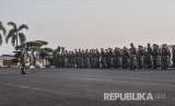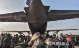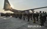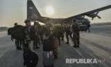 REPUBLIKA.CO.ID, JAKARTA -- Prajurit TNI bersiap masuk kedalam pesawat untuk melakukan tugas misi kemanusian gempa Palu, Sulawesi Tengah di Base Ops Pangkalan Udara Militer Halim Perdana Kusuma, Jakarta, Sabtu (29/9).