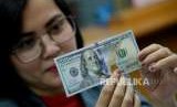 Petugas memeriksa kondisi dolar Amerika Serikat di gerai penukaran mata uang asing di Jakarta, Selasa (2/10). (FOTO : Republika/Prayogi)