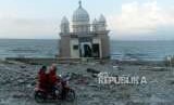 Pengendara motor melintas didekat Masjid Arwan Bab Al Rahman yang hancur di kawasan Pantai Talise, Palu, Sulawesi Tengah, Selasa (2/10). (FOTO : Republika/Putra M. Akbar)
