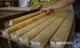 Perajin menata susunan tempe di salah satu tempat pembuatan tempe di Pekanbaru, Riau, Kamis (4/10). Pengusaha tempe terpaksa mengurangi ukuran produknya agar usaha mereka tetap berjalan terkait harga bahan baku kedelai yang terus naik di pasaran. (FOTO : Ronny Muharman/Antara)