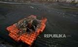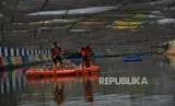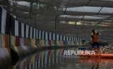 REPUBLIKA.CO.ID, JAKARTA -- Petugas PPSU membersihkan Kali Item/ Kali Sentiong yang ditutupi jaring di kawasan Wisma Atlet, Kemayoran Jakarta Pusat, Jumat (5/10).