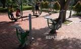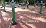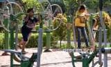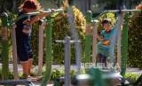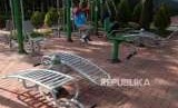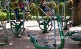 REPUBLIKA.CO.ID, JAKARTA -- Anak-anak bermain dilokasi fasilitas fitnes terbuka gratis di kompleks GOR Ragunan, Jakarta, Ahad (7/10).