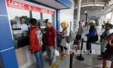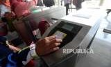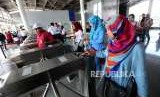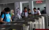 Sejumlah penumpang melakukan taping saat keluar Stasiun Cakung yang telah di lakukan modernisasi, Jakarta, Selasa (9/10). (FOTO : Republika/Mahmud Muhyidin)