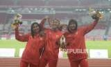 Atlet lari Indonesia Putri Aulia bersama Ni Made Arianti Putri dan Endang Sari Sitorus memperlihatkan medali usai pertandingan babak final nomor 100 meter putri T13 Asian Para Games 2018 di Stadion Utama Gelora Bung Karno, Jakarta, Rabu (10/10). (FOTO : Republika/Putra M. Akbar)