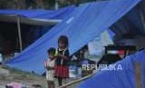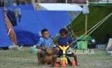 Dua orang anak berada di posko pengungsi korban gempa dan tsunami di Masjid Agung Darussalam kota Palu, Sulawesi Tengah, Rabu (10/10). (FOTO : Republika/Edwin Dwi Putranto)