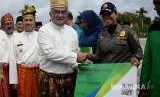 Direktur Investasi BPJS Ketenagakerjaan Amran Nasution menyerahkan katru kepada para perwakilan pekerja rentan penerima BPJS ketenagakerjaan disaksikan Bupati Siak Syamsuar (kedua kiri) di kantor Bupati Siak, Riau, Jumat (12/10).BPJS Ketenagakerjaan menyalurkan donasi CSR dari Bank Riau Kepri kepada 35 ribu pekerja. (FOTO : Prayogi/Republika)