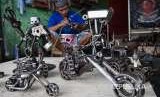 Perajin membuat kerajinan dari limbah onderdil sepeda motor di Tohudan, Colomadu, Karanganyar, Jawa Tengah, Jumat (12/10). Untuk menyelesaikan satu unit kerajinan tersebut perajin setempat membutuhkan waktu sehari hingga satu minggu. Produk kerajinan tersebut dijual dengan harga Rp75.000 hingga Rp500.000. (FOTO : Mohammad Ayudha/Antara)
