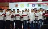 Ketua Tim Kampanye Nasional (TKN) Koalisi Indonesia Kerja Joko Widodo-Ma'ruf Amin, Erick Thohir (kedua kiri) memimpin pengucapan janji pada acara PengukuhanTim Kampanye Daerah dan Konsolidasi Pemenangan Pilpres 2019 di Hotel Asrilia, Kota Bandung, Ahad (14/10). (FOTO : Republika/Edi Yusuf)