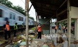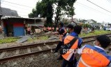 Petugas merobohkan bangunan liar yang berdiri di sepanjang jalur kereta antara Stasiun Pasar Minggu dan Pasar Minggu Baru, Jakarta, Rabu (17/10). (FOTO : Republika/Putra M. Akbar)