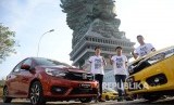 Business & Product Planning Director PT Honda Prospect Motor Takayuki Uotani , Large Project Leader All New Honda Brio, Honda R&D Asia Pacific Co.Ltd Tsutomu Harano dan Marketing and After Sales Service Director PT Honda Prospect Motor Jonfis Fandy berfoto pada acara Break Out Braek Free Media Test Drive All New Honda Brio di Kawasan GWK, Bali, Rabu (17/10). (FOTO : Prayogi/Republika)