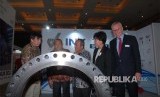 Seorang peserta pameran (kiri) menjelaskan produknya saat dikunjungi oleh Ketua Umum Asosiasi Industri Pengecoran Logam Indonesia (APLINDO) Achmad Safiun, Direktur Industri Metal Kementerian Industri Doddy Rahadi, Direktur Wakeni Rini Sumardi dan Managing Director Messe Dusseldorf Asia Germot Ringling (kiri-kanan) pada pembukaan pameran Indo,etal 2018 di Jakarta, Rabu (17/10). (FOTO : Dok Indometal)