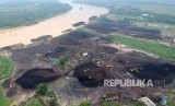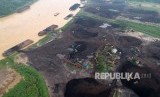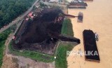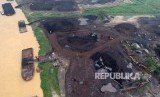 REPUBLIKA.CO.ID, MUAROJAMBI -- Aktivitas perusahaan penimbunan batu bara yang dilakukan secara terbuka di tepi Sungai Batanghari terlihat dari Muarojambi, Jambi, Kamis (18/10).