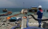 Seorang petugas mengamati dermaga yang rusak di Terminal BBM Donggala disela acara Kick Off Pemulihan Infrastruktur BBM Pasca Bencana Gempa Bumi dan Tsunami di Terminal BBM Donggala, Sulawesi Tengah, Kamis (18/10) (FOTO : Darmawan/Republika)
