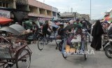 Becak nampak hilir mudik di kisaran pasar Impres Palu, Sulawesi Tengah, Sabtu (20/10). (FOTO : Darmawan / Republika)