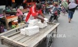 Pedagang mengangkat tempe yang akan dimasukkan ke kiosnya di pasar Impres Palu, Sulawesi Tengah, Sabtu (20/10). (FOTO : Darmawan / Republika)