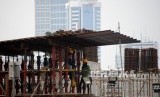 Pekerja menyelesaikan pembangunan Light Rail Transit (LRT) Jabodebek di Kawasan Jalan Rasuna Said, Kuningan, Jakarta, Ahad (21/10). (FOTO : Republika/Prayogi)