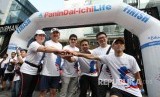 Presiden Direktur PT Panin Dai-ichi Life Fadjar Gunawan (kedua kiri) bertumpu tangan dengan istri Lolita Gunawan (dari kiri), Wakil Presiden Direktur Simon Imanto, Corporate Secretary PT Panin Bank Tbk Jasman Ginting, Direktur PT Panin Dai-Ichi Life Andrew Baim dan Direktur Keninchi Fukuda sebelum melepas Bekal Hidup Charity Fun Walk di Jakarta, Minggu (21/10). Tema Bekal Hidup diambil untuk mengedukasi masyarakat tentang kesehatan. (FOTO : Dok Panin Dai-ichi)