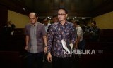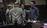 Terdakwa kasus suap dan gratifikasi terkait proyek-proyek di Dinas Pekerjaan Umum dan Perumahan Rakyat (PUPR) Provinsi Jambi, Zumi Zola (kiri) berbicang bersama saksi usai menjalani sidang dengan yang beragendakan konfortir dan pemeriksaan terdakwa di Pengadilan Tindak Pidana Korupsi (Tipikor), Jakarta, Senin (22/10). (FOTO : Republika/Iman Firmansyah)