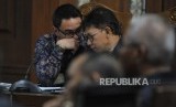 Terdakwa kasus suap dan gratifikasi terkait proyek-proyek di Dinas Pekerjaan Umum dan Perumahan Rakyat (PUPR) Provinsi Jambi, Zumi Zola berbincang bersama penasehat hukum saat menjalani sidang dengan yang beragendakan konfortir dan pemeriksaan terdakwa di Pengadilan Tindak Pidana Korupsi (Tipikor), Jakarta, Senin (22/10). (FOTO : Republika/Iman Firmansyah)