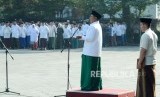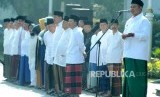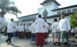 Bertepatan dengan Hari Santri Nasional (HSN), Wakil Gubernur Jawa Barat Uu Ruzhanul Ulum bersama Aparatur Sipil Negara (ASN) Provinsi Jawa Barat berdinas dengan memakai busana muslim lengkap dengan sarung, di Gedung Sate, Kota Bandung, Senin (22/10). (FOTO : Republika/Edi Yusuf)