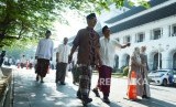 Bertepatan dengan Hari Santri Nasional (HSN) Aparatur Sipil Negara (ASN) Provinsi Jawa Barat berdinas dengan memakai busana muslim lengkap dengan sarung, di Gedung Sate, Kota Bandung, Senin (22/10). (FOTO : Republika/Edi Yusuf)