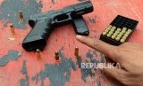 Petugas memperlihatkan senjata api beserta peluru yang akan digunakan pada uji balistik senjata api Glock 17 di lapangan tembak Mako Brimob, Kelapa Dua, Depok, Jawa Barat, Selasa (23/10). (FOTO : Republika/Putra M. Akbar)
