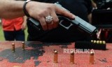 REPUBLIKA.CO.ID, JAKARTA -- Petugas memperlihatkan senjata api beserta peluru yang akan digunakan pada uji balistik senjata api Glock 17 di Lapangan Tembak Mako Brimob, Kelapa Dua, Depok, Jawa Barat, Selasa (23/10).
